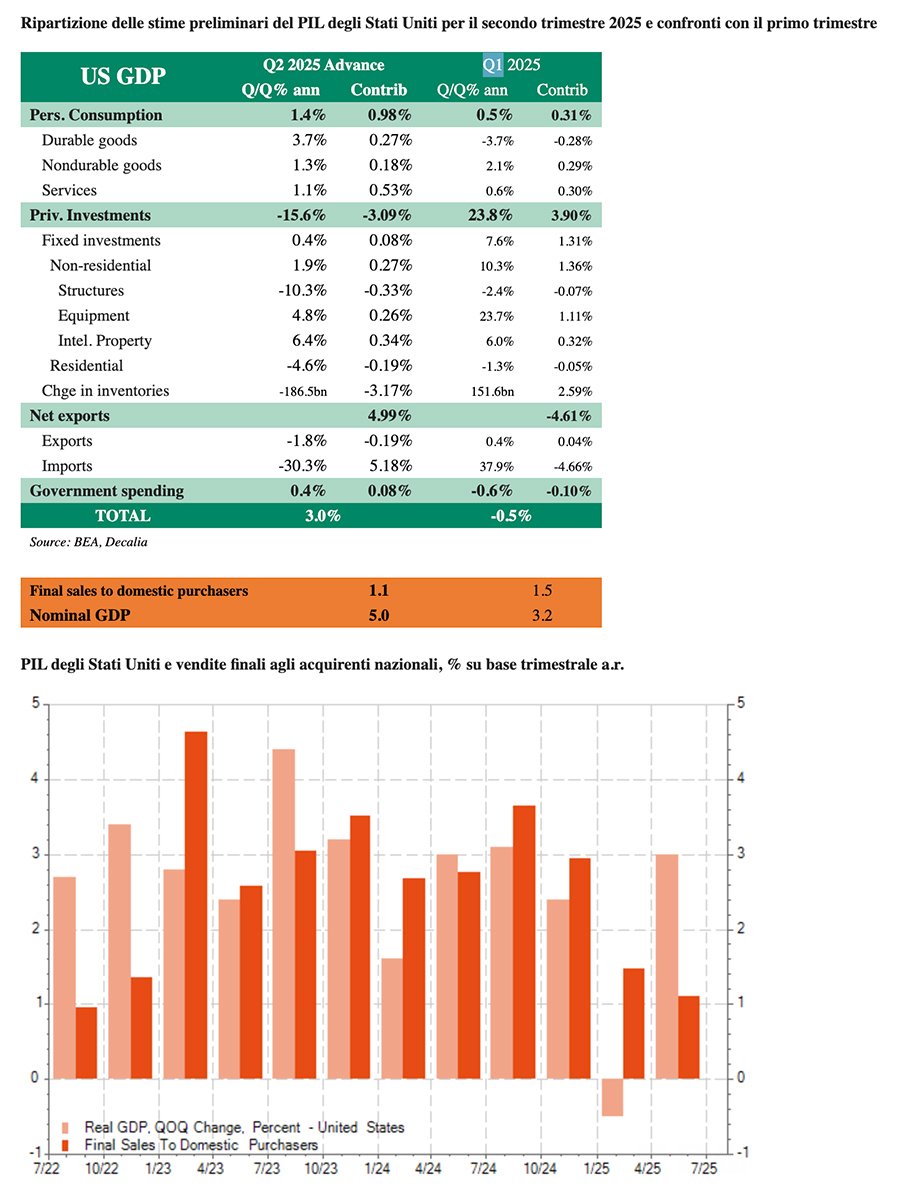 MERCATI – Economia statunitense: crescita o recessione?. A cura di Fabrizio Quirighetti di DECALIA. Nell’ultimo trimestre la crescita del PIL statunitense ĆØ stata deludente (-0,5%), ma i dettagli non erano poi cosƬ negativi. Questa volta, il dato relativo al PIL statunitense nel secondo trimestre ha superato le aspettative (3,0% contro il 2,6% previsto), ma i dettagli non sono cosƬ rosei come invece suggerirebbe la soliditĆ di questo dato. La causa di queste distorsioni rimane tuttavia la stessa: l’anticipo delle importazioni statunitensi e l’accumulo di scorte nel primo trimestre, in vista dell’annuncio dei dazi commerciali USA, e il conseguente crollo delle importazioni statunitensi e l’esaurimento delle scorte nel secondo trimestre. Escludendo queste distorsioni straordinarie, ovvero concentrandosi solo sulla domanda interna finale (vale a dire spese per consumi e investimenti), questo rapporto rimane perfettamente in linea con il nostro scenario di atterraggio morbido, secondo cui l’economia statunitense sta rallentando ma senza esagerare, suggerendo quindi che l’attuale politica monetaria della Fed sembra appropriata. O almeno non c’ĆØ urgenza di abbassare i tassi, con tutto il rispetto per il presidente Trump.